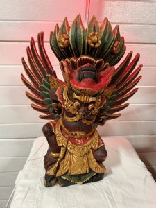 Escultura antiga de Garuda, talhada em madeira e policromada, posteriormente transformada em candeeiro. Peça grande, decorativa e com detalhes tradicionais do sudeste asiático. Apresenta desgaste natural, pequenas falhas e fendas próprias da idade, sem comprometer a estabilidade ou o uso.