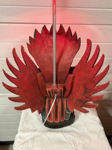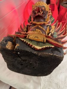 Escultura antiga de Garuda, talhada em madeira e policromada, posteriormente transformada em candeeiro. Peça grande, decorativa e com detalhes tradicionais do sudeste asiático. Apresenta desgaste natural, pequenas falhas e fendas próprias da idade, sem comprometer a estabilidade ou o uso.