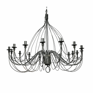 Imponente candeeiro de tecto em ferro forjado, peça de grande presença decorativa e rara pelas suas dimensões generosas. Executado com estrutura artesanal em ferro trabalhado, apresenta um elegante desenho com múltiplos braços harmoniosamente curvados, conferindo leveza visual apesar da sua robustez.