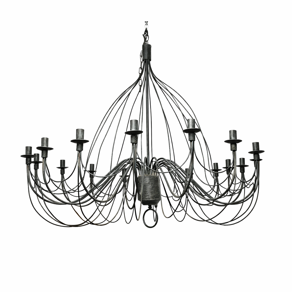 Imponente candeeiro de tecto em ferro forjado, peça de grande presença decorativa e rara pelas suas dimensões generosas. Executado com estrutura artesanal em ferro trabalhado, apresenta um elegante desenho com múltiplos braços harmoniosamente curvados, conferindo leveza visual apesar da sua robustez. Possui 16 lumes, proporcionando excelente capacidade de iluminação, sendo ideal para espaços amplos como… Continue a ler Imponente Candeeiro de Tecto em Ferro Forjado – 16 Lumes – 120 cm